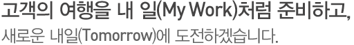 ¶ÇÇÑ, °í°´ÀÇ ÇູÀ» ½ÇÇö½ÃÄѵ帮±â À§ÇØ ²÷ÀÓ¾øÀÌ ¿¬±¸ÇÏ°í ¡®³»ÀÏ(Tomorrow)¡¯À» ÇâÇÑ »õ·Î¿î ¿©Ç๮ȸ¦ ¼±µµÇÏ´Â ¸®µù ±â¾÷(Leading Company)À¸·Î ÀÚ¸®¸Å±èÇÒ °ÍÀ» È®½ÅÇÕ´Ï´Ù.