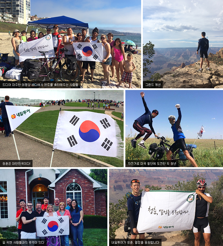 ³»ÀÏÅõ¾î´Â ÀþÀº ûÃáÀ» ÀÀ¿øÇÕ´Ï´Ù. ûÃáµéÀÇ ²Þ¿¡ ³¯°³¸¦ ´Þ¾ÆÁÖ±â À§ÇÏ¿©, ³»ÀÏÅõ¾î´Â ÀÌ¿ìÂù, Á¤ÁØÈ£ ±ºÀÇ ¹Ì±¹ ÀÚÀü°Å Ⱦ´ÜÀ» ÈÄ¿øÇß½À´Ï´Ù. ¹Ì±¹ µ¿ºÎºÎÅÍ ¼ºÎ±îÁö 6,000km¿¡ ´ÞÇÏ´Â ±æÀ» ¿À·ÎÁö µÎ ¹ß°ú ¿Â ¸öÀ¸·Î ÇìÃijª°¡´Â ½±Áö ¾ÊÀº ¿©Á¤À̾ú½À´Ï´Ù. µÎ Ä£±¸´Â ¼·Î ÀÇÁöÇÏ¸ç ¶§·Î ¿ô°í ¶§·Î ÁöÄ¡°í ¶§·Î ÀÚ¿¬°ú »ç¶÷¿¡ °¨µ¿¹ÞÀ¸¸ç, ±¤È°ÇÑ ¹Ì±¹ ´ë·úÀ» Ⱦ´ÜÇß½À´Ï´Ù. ¿©Á¤ Áß°£¿¡ ÁØÈ£ ±ºÀÌ ¶æÇÏÁö ¾ÊÀº ºÎ»óÀ» °Þ°Ô µÇ¾î, ¿ìÂù ±º Ȧ·Î ¡®¹Ì±¹ ÀÚÀü°Å Ⱦ´Ü¡¯À̶ó´Â ²ÞÀ» ÇâÇØ ´Þ·È´Âµ¥¿ä. Ãâ¹ßÇÑ Áö 2°³¿ù 1ÁÖ ¸¸¿¡ °á±¹ ¿ìÂù ±ºÀº ¹Ì±¹ µ¿-¼ ÀÚÀü°Å Ⱦ´Ü¿¡ ¼º°øÇß½À´Ï´Ù. °íµÈ µµÀü ³¡¿¡ ÅÂÆò¾ç ¹Ù´Ù¸¦ ¸¸³ª´ø ¼ø°£ÀÇ °¨µ¿ÀÌ Ã»ÃáÀÇ ÇÑ ÆäÀÌÁö¸¦ ¸ÚÁö°Ô Àå½ÄÇßÀ¸¸®¶ó È®½ÅÇÕ´Ï´Ù. ³»ÀÏÅõ¾î°¡ µÎ ûÃáÀÇ ¿Á¤À» ÀÀ¿øÇÕ´Ï´Ù.